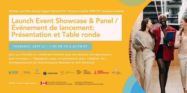 Join us virtually on Thursday, September 21st from 1:00 PM – 2:30 PM ET as we unveil the launch of WIN-VC Canada (Women and Non-binary Impact Network for Venture Capital) — a collaborative of organizations working to provide services, programming, events, and dedicated resources to women and non-binary entrepreneurs and gender lens investors across Canada who strive to generate positive social or environmental change through their ventures and investments.
